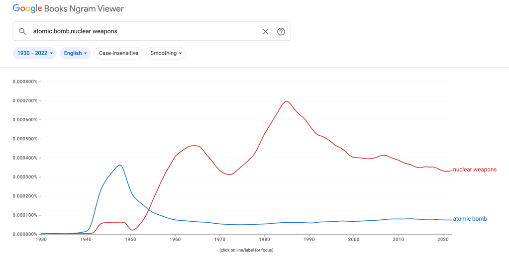 Using the tool Google N-gram, the graph above shows the waxing and waning in salience of the concepts of ‘nuclear weapons’ and ‘atomic bomb’ within Google’s corpus of books published in English.
